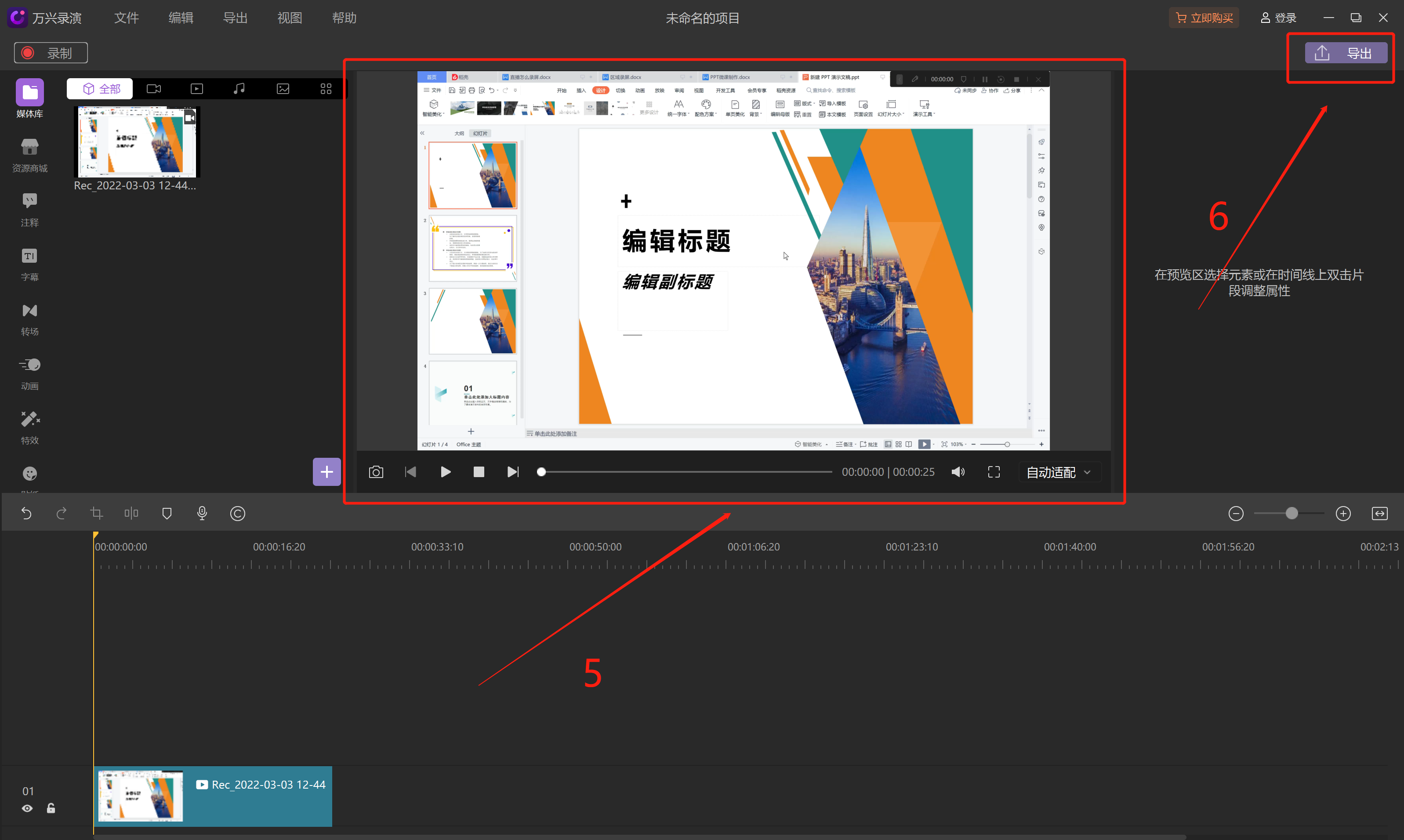 步骤六:完成录制后,视频会直接导入剪辑界面。可以在“3”的红框中添加注释、字幕、转场、动画、贴纸等特效。可以在“4”的红框中对视频进行剪裁、切割、添加标记和录音等操作。